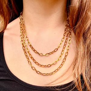 Achieve an effortless, high-fashion look with our Aria 3-tier layered chunky oval link necklace. Available in both Gold Plated and Sleek Silver finishes, this stunning statement piece features three perfectly spaced strands—16", 17", and 18"—all attached to a single clasp to prevent tangling. Finished with a sophisticated satin (brushed) texture, this necklace offers a modern, muted glow that transitions from day to night. It's light weight and moves easily with you.