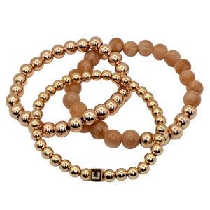 Celebrate growth and positivity with the Blush Stretch-to-Fit Bracelet Stack featuring Rose Gold-Plated Beads and Pink Sunstone Gemstones.This handcrafted Lizzy James stack combines elegance, modern style, and meaningful design. Featuring 6mm and 4mm rose gold-plated beads paired with 7mm pink sunstone gemstone beads, the Blush Bracelet Stack radiates warmth, beauty, and empowering energy.