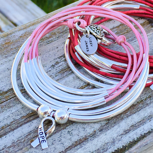 Show your support in style with the Girlfriend Wrap Bracelet in Pink Leather with Silver Accents and Awareness Charm.Handcrafted with care in our San Diego studio, this meaningful wrap bracelet combines beauty and purpose. Designed with two strands of light gloss pink leather, silver-plated crescents and beads, and a HOPE awareness charm, it’s the perfect accessory to wear as a daily reminder of strength, love, and resilience.