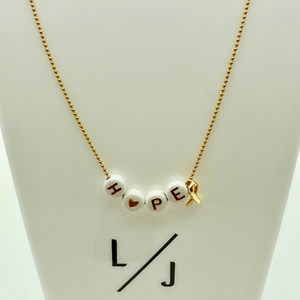 Embrace meaningful style with the Lizzy James Hope Necklace.This elegant design is handcrafted on a matte gold-plated ball chain and features crisp white matte acrylic beads with gold lettering that spell outHOPE. A radiant gold-plated awareness charm, adorned with sparkling cubic zirconia stones, completes the piece—an inspiring symbol of strength, courage, and unwavering faith.