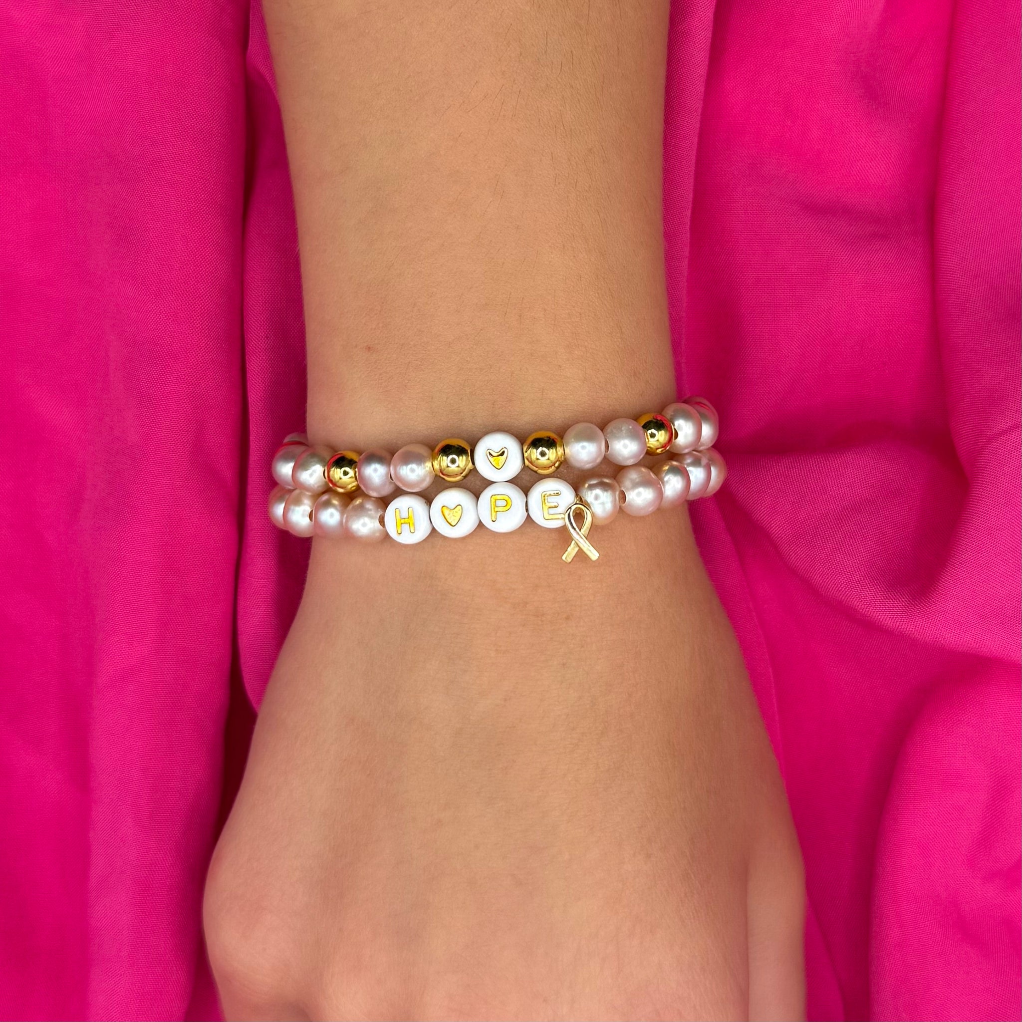 Find comfort, strength, and meaning with the Hope Stretch-to-Fit Bracelet Stack. This handcrafted Lizzy James design blends elegance with heartfelt symbolism, making it a timeless addition to your jewelry collection. Featuring lustrous gold-plated 5mm beads, soft pink freshwater pearls, and white and gold acrylic letter beads spellingHOPE, this bracelet stack carries a powerful reminder of love, belonging, and resilience. A delicate gold-plated mini awareness charm completes the look with a meaningful touch.