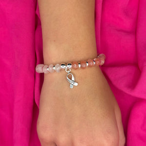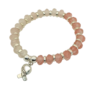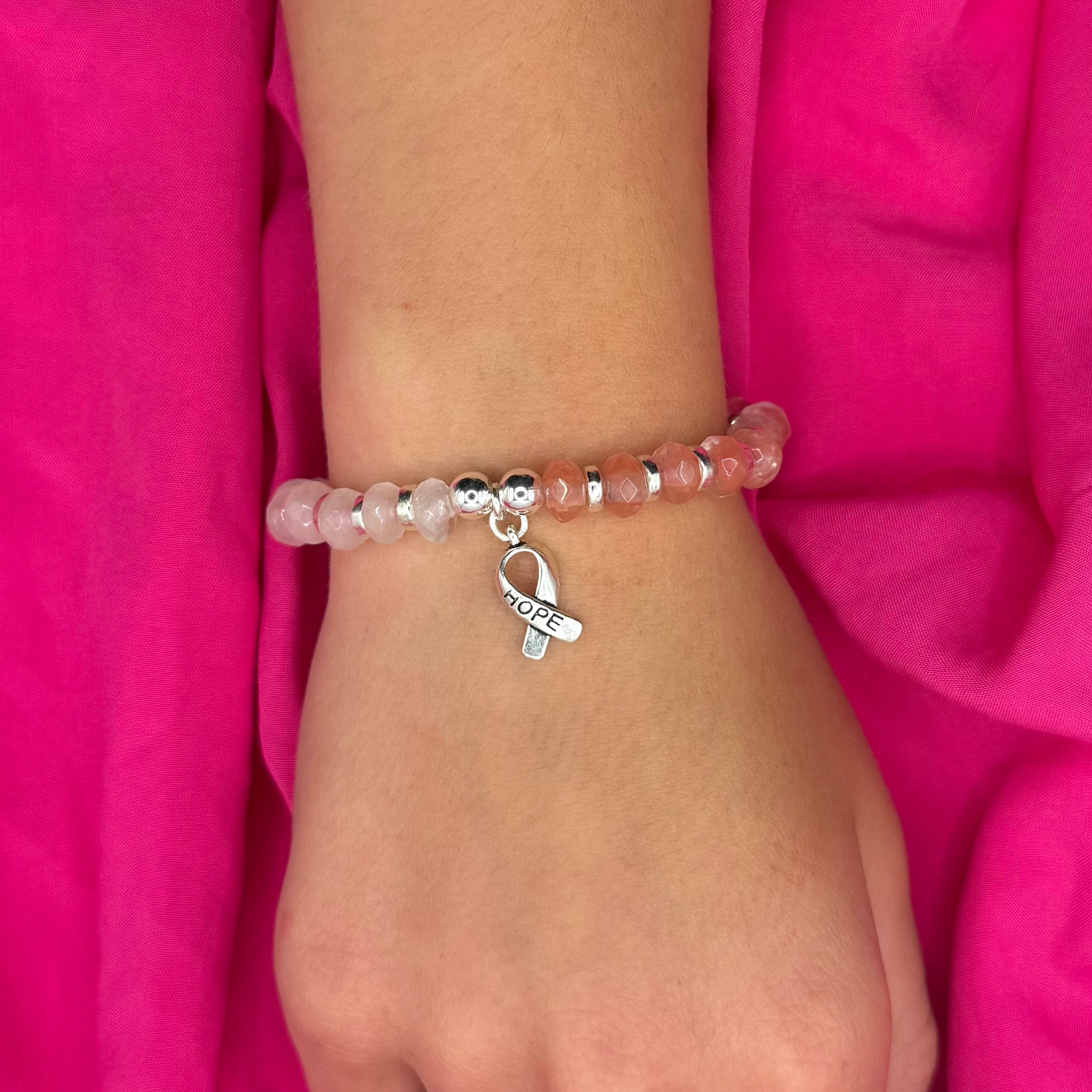 Elevate your style and mindset with the Inspire Stretch-to-Fit Bracelet featuring Rose & Cherry Quartz with HOPE Charm.This handcrafted Lizzy James bracelet stack combines elegance, meaning, and effortless wear. Designed with faceted rose and cherry quartz beads, sparkling silver-plated accents, and a HOPE awareness charm, the Inspire Bracelet radiates positivity, encouragement, and timeless style.