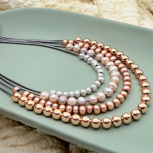 The Pearl Essence Necklace is a luminous fusion of classic elegance and modern artistry. Handcrafted with three strands of genuine freshwater pearls in silver, blush pink, and soft rose, each pearl is chosen for its natural beauty and radiant glow. The fourth strand features rose gold–plated beads artfully strung on four strands of metallic silver leather, bringing a contemporary edge to the timeless allure of pearls.