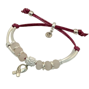 Carry a message of love and strength with the Promise Adjustable Bracelet in Pink Leather with Rose Quartz & Awareness Charm.This handcrafted Lizzy James design blends timeless style with meaningful symbolism. Featuring two strands of distressed pink leather, silver-plated crescents and beads, and frosted rose quartz gemstone beads, the bracelet radiates calm, positivity, and resilience. A pink HOPE awareness charm adds a heartfelt touch, making it a daily reminder of courage, self-love, and empowerment.