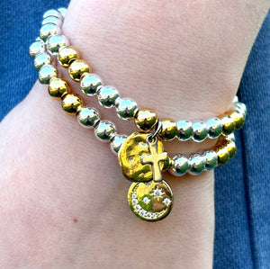 Add a touch of shine and sophistication to your everyday style with our Zenzie Gold Plated and Silver Plated Beaded Bracelet — the ultimate stackable bracelet for summer and beyond. Handcrafted with 6mm silver and gold plated beads and accented with a delicate silver crescent, this versatile stretch-to-fit bracelet brings a timeless yet trendy look to any outfit.