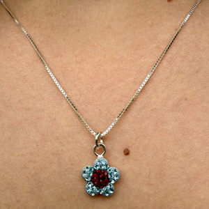 The Aquamarine Bloom Adjustable Necklace features a radiant aquamarine-blue and red crystal flower pendant suspended from a sterling silver adjustable chain. Delicate crystal petals catch the light beautifully, creating soft shimmer with every movement.