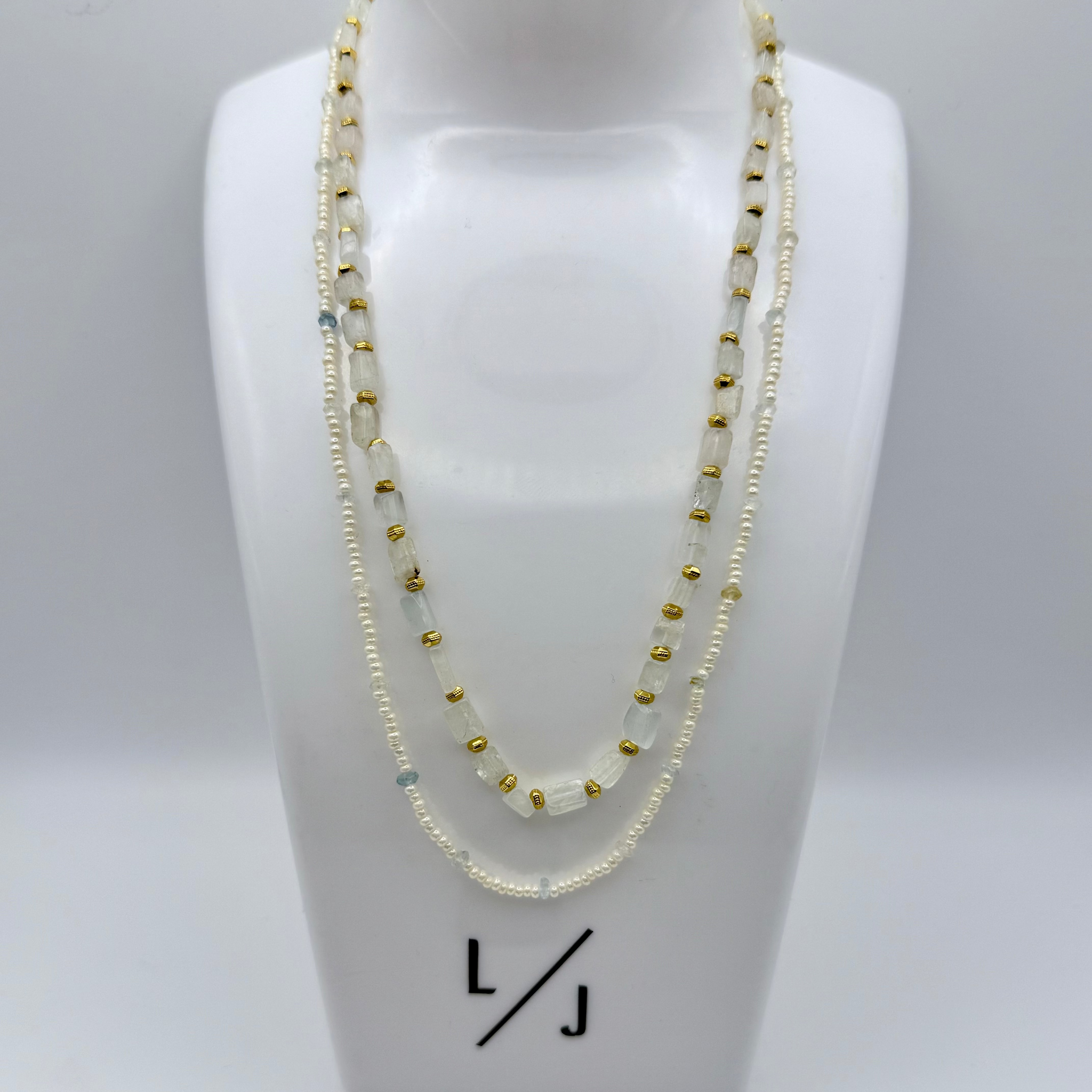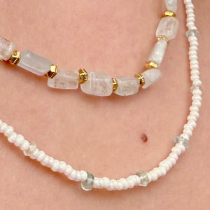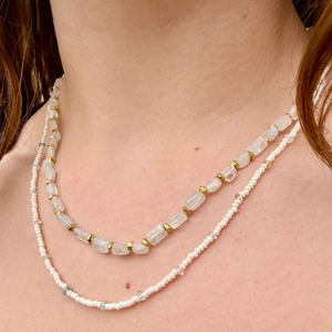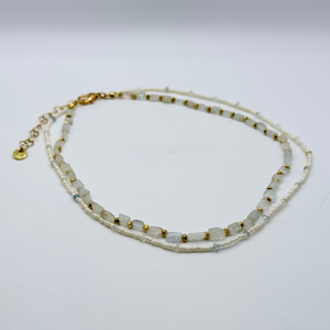 The Aquamarine Luma Layered Necklace features two delicate strands of opaque pearl seed beads accented with natural Aquamarine gemstones chips and faceted gold hexagon rondelle beads. The combination creates a beautiful balance of soft luminosity, subtle sparkle, and organic texture.
