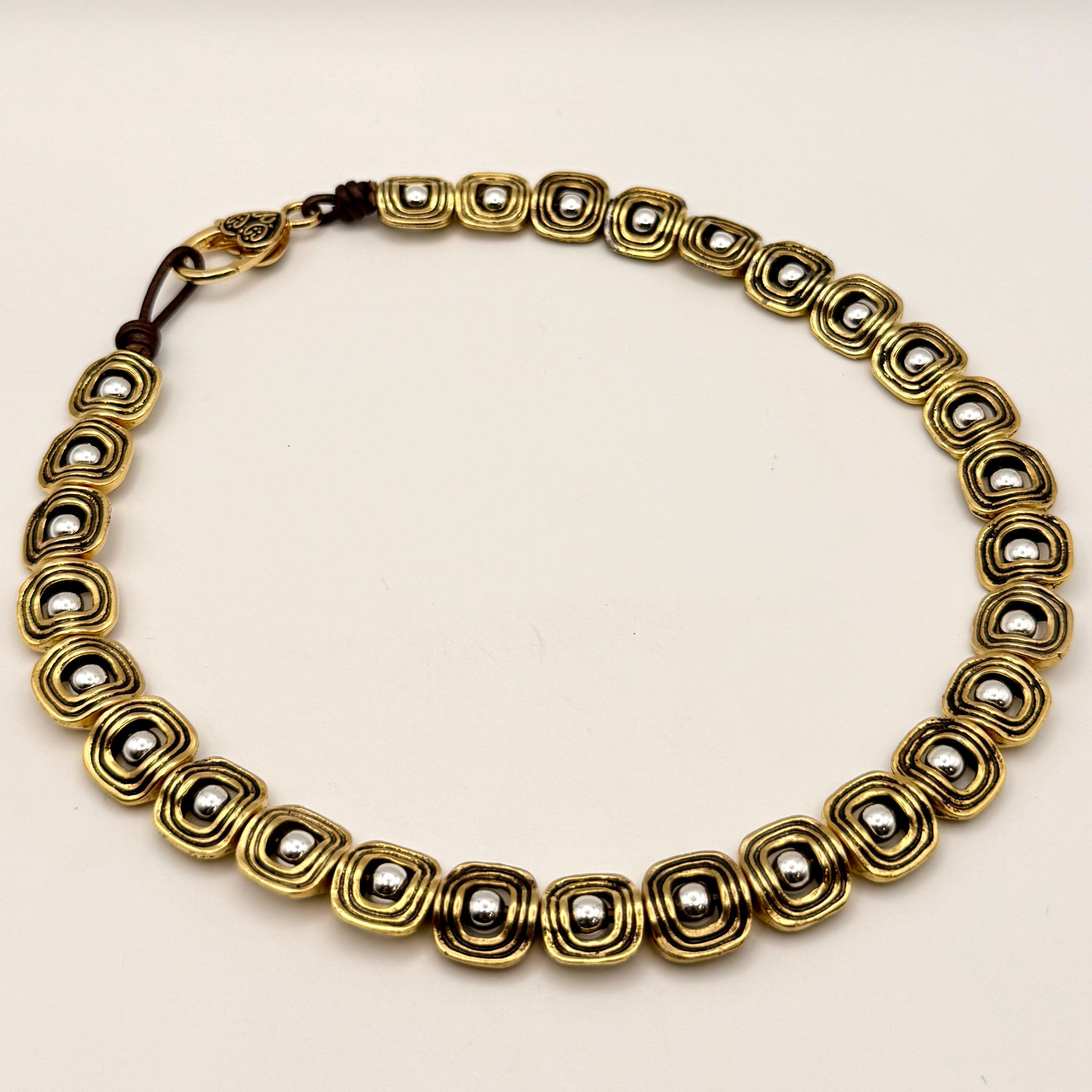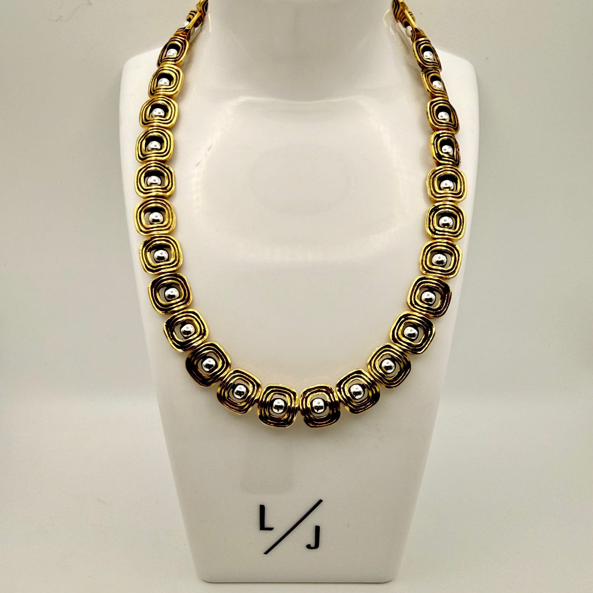 The Valencia Square Necklace features intricately layered antique gold open square beads, each cradling a luminous silver-plated round bead at its center. The contrast of warm gold framing cool silver creates dimensional depth — bold yet refined.