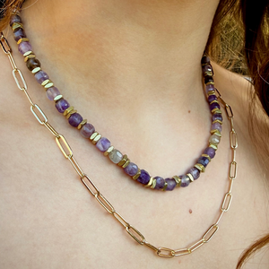 Amethyst is a remarkable variety of quartz, prized for its calming energy and striking color. Because we use 100% natural stones, your necklace is a one-of-a-kind work of art.