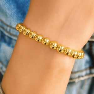 Bring a touch of golden radiance to your everyday style with the Lori Gold Beaded Bracelet, a classic stackable bracelet that shines year-round. Handcrafted with polished 7mm gold-plated beads and accented by a sleek gold-plated crescent, this versatile stretch-to-fit bracelet delivers timeless elegance with a modern edge.